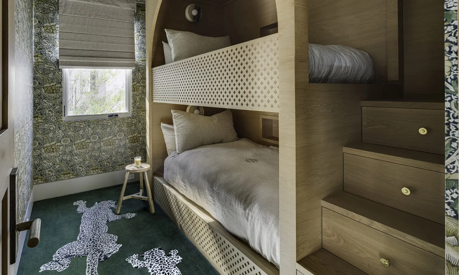 From the emerald green jaguar carpeting and floor-to-ceiling floral wallpaper in the bunk room, to the monumental 59-bulb Lindsey Adelman chandelier in the entryway, every room offers its own rhythm that is layered and luxe, bold and balanced – and always a true reflection of the client’s unique taste.