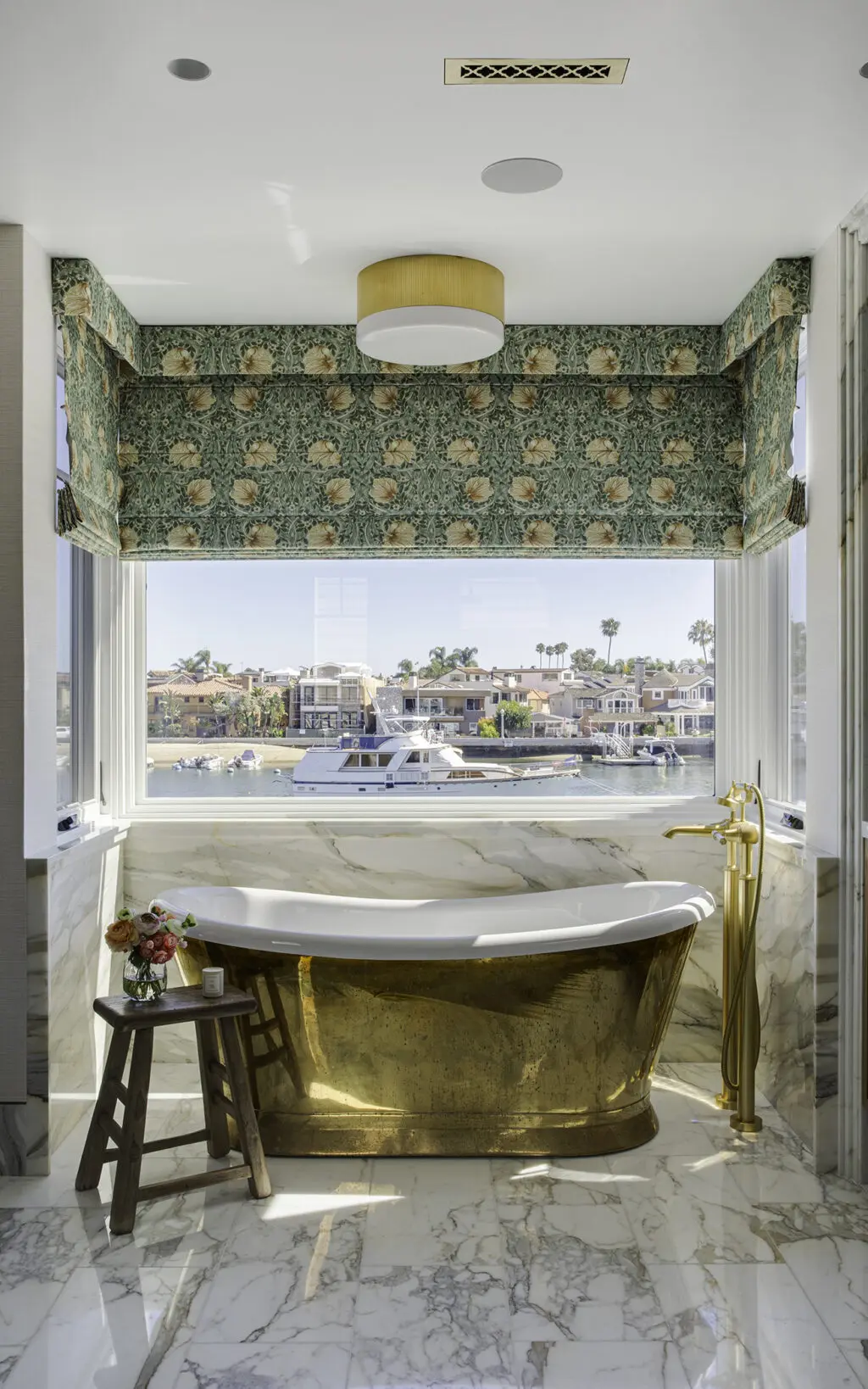 The room is clad floor-to-ceiling in Calacatta Borghini stone, setting a serene, monolithic tone. Visual Comfort lighting, Morris & Co blinds, and bespoke detailing balance the room’s vibrant composition, creating a haven of indulgence and design precision.