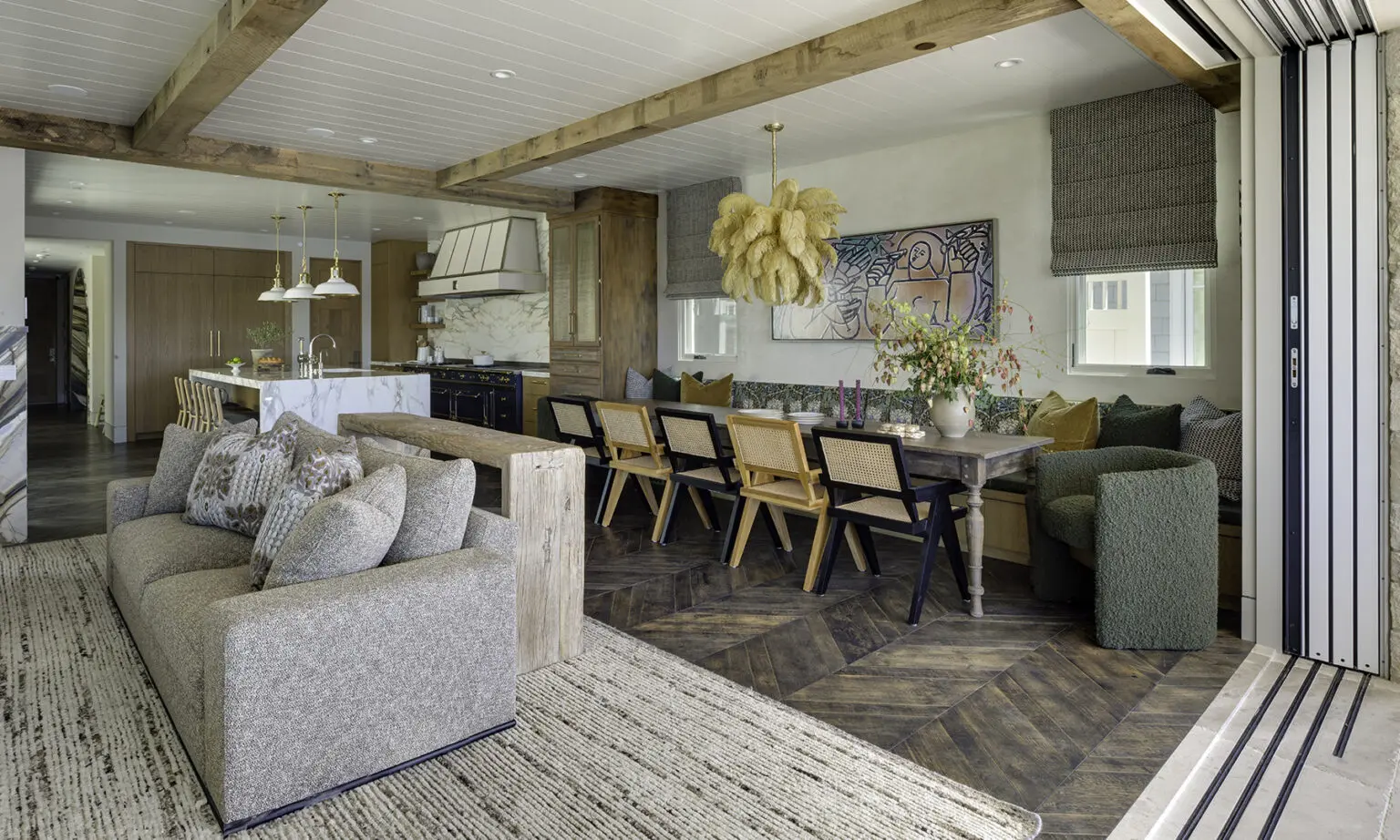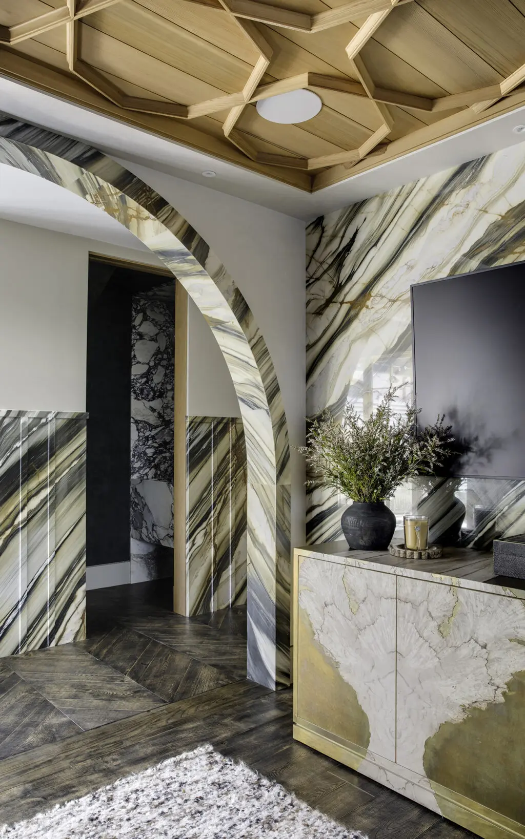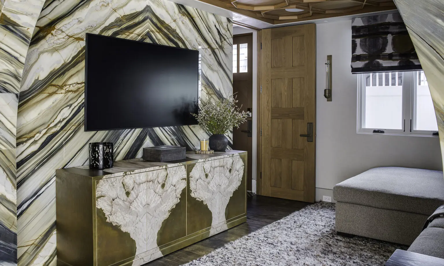 The tonal direction throughout the home is what Bryen refers to as “sophisticated opulence with a pop.” Across every room, deep colour stories and architectural forms are enriched by bold textures, gold metallic highlights, and fine detailing. In the lounge turned green room, for example, an intricate coffered ceiling and chevron wood flooring frame a dramatic stone fireplace. A second larger living area includes a Lindsey Adelman Studio Branching Disk chandelier, adding contemporary poise above a Rene Cazares sofa and Black Creek Mercantile coffee table.