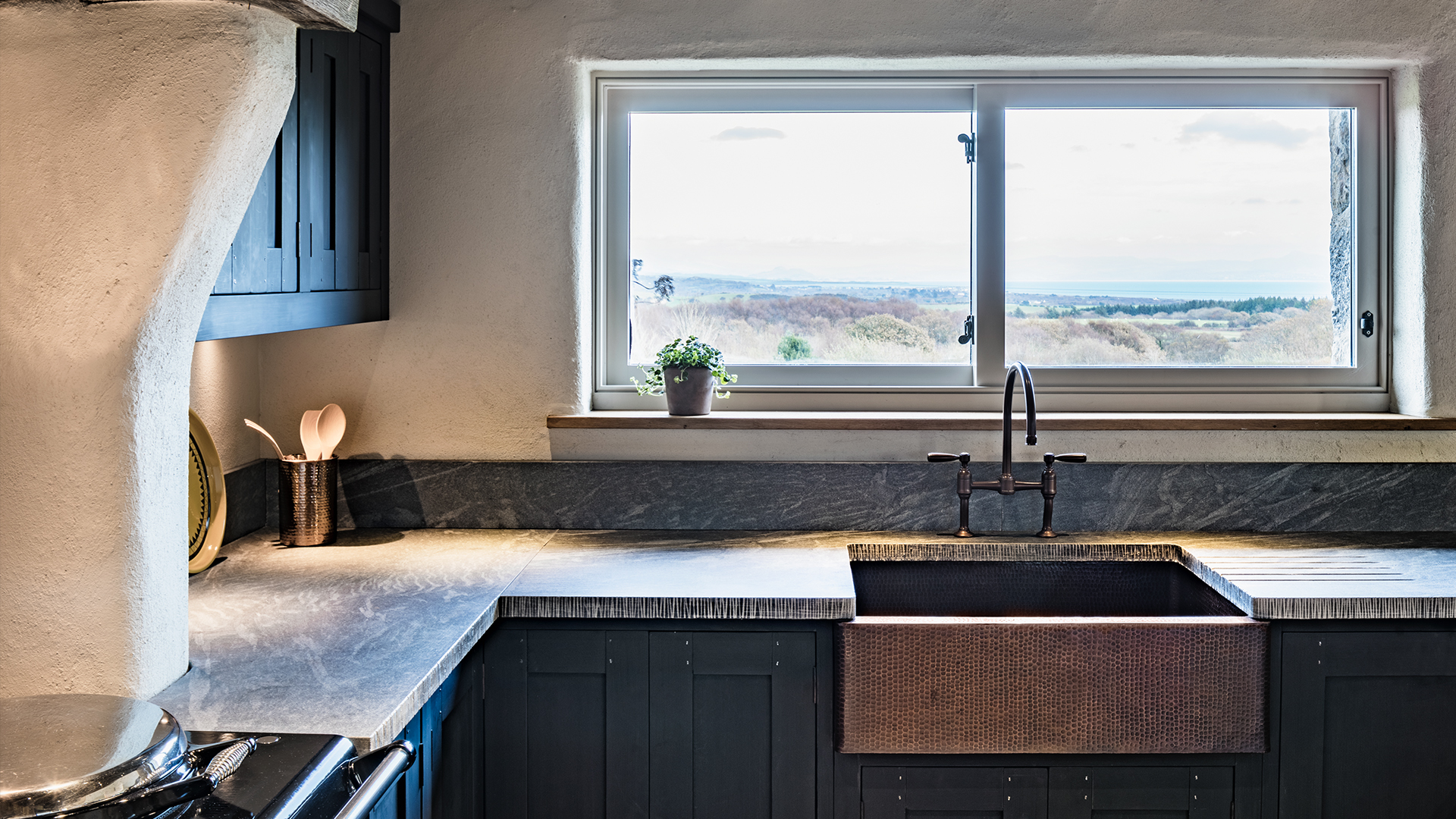 Lewis Knox developed the interior design concept over a period of months, investing time into every aspect of the material choices to appeal to the dynamic brief. To create a memorable feel, separate personalities were created for each room by using distinctive colour palettes, however lime plaster, polished concrete and raw oak were included throughout to maintain consistent character. Furnishings were selected to be stylish yet fitting for the wild coastal hillside, with windows dressed accordingly in wool for the snug, relaxed heavy linen in the living areas and linen voile curtains in the bedrooms.