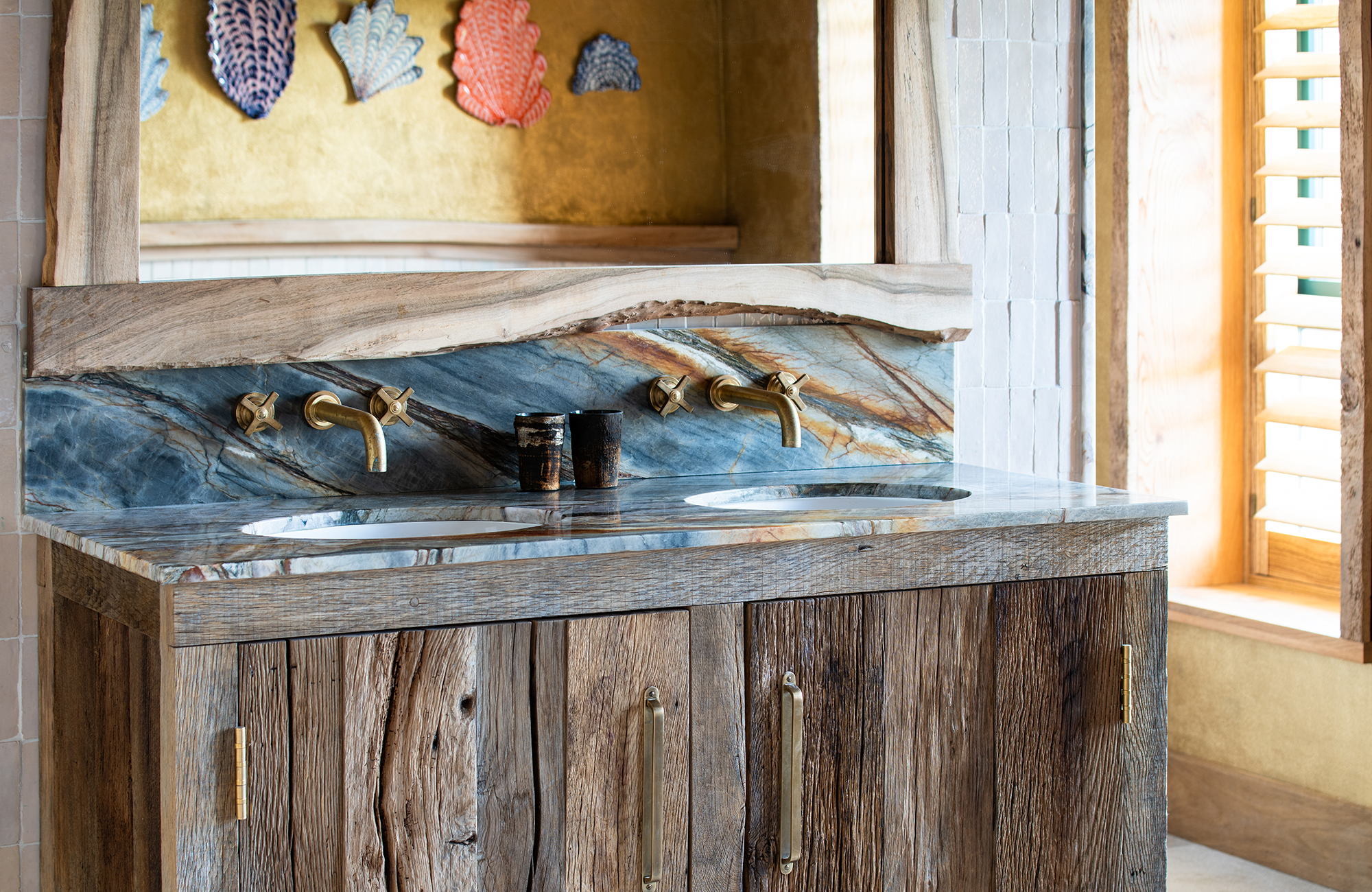 A charming rustic touch is injected with a bespoke whimsical aged oak vanity – its split wooden doors impart quirky character. ‘I had a vision of what I wanted but I hadn’t seen anything like it that I could buy so I knew I would have to have it made,’ explains Siân. ‘I spent four days going through the wood collection I have outside to find the perfect timber for the vanity as I wanted it to have split wooden doors.’ The result is a statement hero piece, with the same Italian stone used on the work surface and splashback, injecting opulence and providing a continuous cohesive thread. A shapely wooden mirror above the vanity brings a whimsical fairytale feel.
