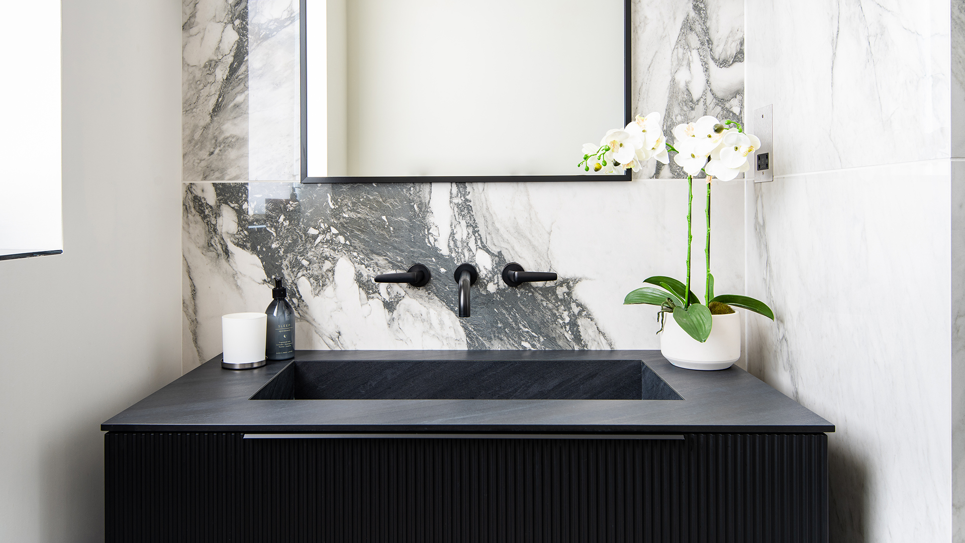In the son’s ensuite, the scheme is monochromatic and masculine, with alluring dark-veined Arabascato marble forming a wow factor backdrop and beautifully echoing the industrial-style black metal-framed shower screen and contemporary reeded black vanity. Our Speed Forme brassware in Matt Black was chosen to complement the dramatic aesthetic, with the gentle curves softening the scheme. ‘The levers and handles are all ergonomic to the touch, and the classic design will age well,’ says Sophie. ‘Throughout, we softened corners where we could to introduce a slight calmness. It’s also a Georgian empire reference – the columns and oval windows are details pulled into the interiors. It’s very subtle and not overstated and makes the schemes a little more feminine and flowing as well. In the son’s ensuite, where there is a masculine palette with darker accents, it’s nice to add a little softness.’