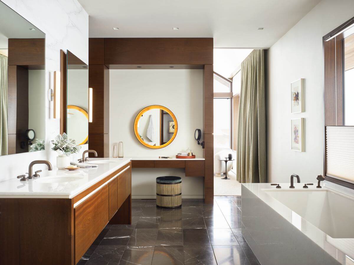 The awe-inspiring detail of Lone Pine pays homage to artisanal influence, with a running theme of ironmongery that enhances the merger of form and function. This includes a steel and leather entry door and a steel stair railing with leather strapping. Meanwhile, the upper master bathroom is fitted with traditional brass accessories by Samuel heath. The client selected our Landmark Industrial collection of brass basin faucets, bath and shower fixtures and a wall-mounted mirror. This collection has a Bauhaus influence, which offers a new artistic flair to the space. A City Bronze finish also complements the warm & decadent palette of surrounding wooden cabinetry and marble flooring.