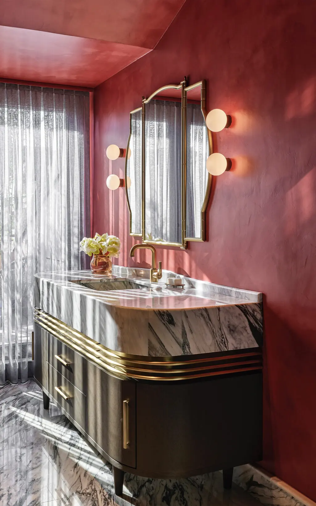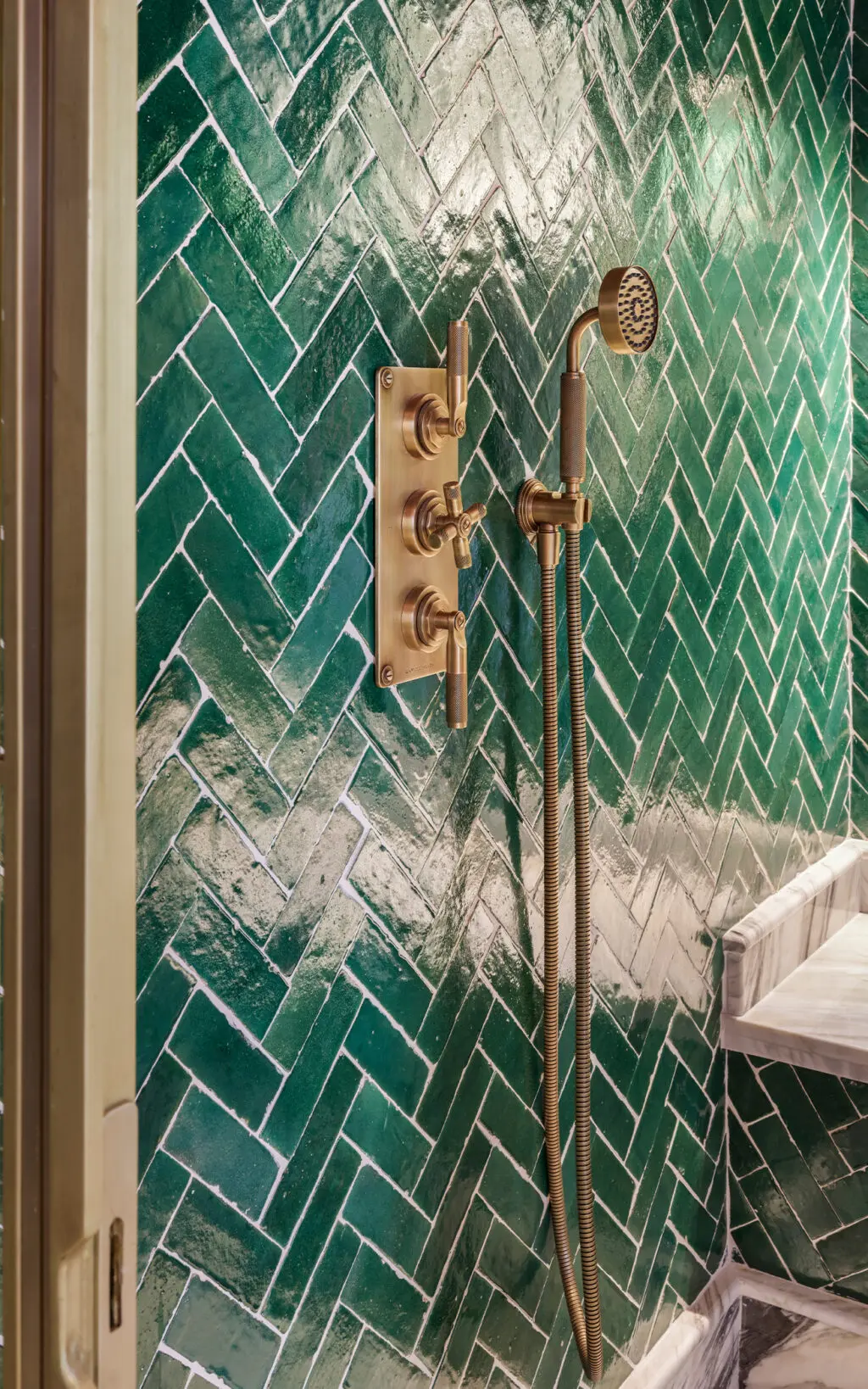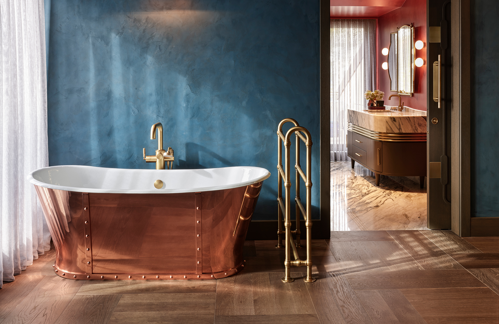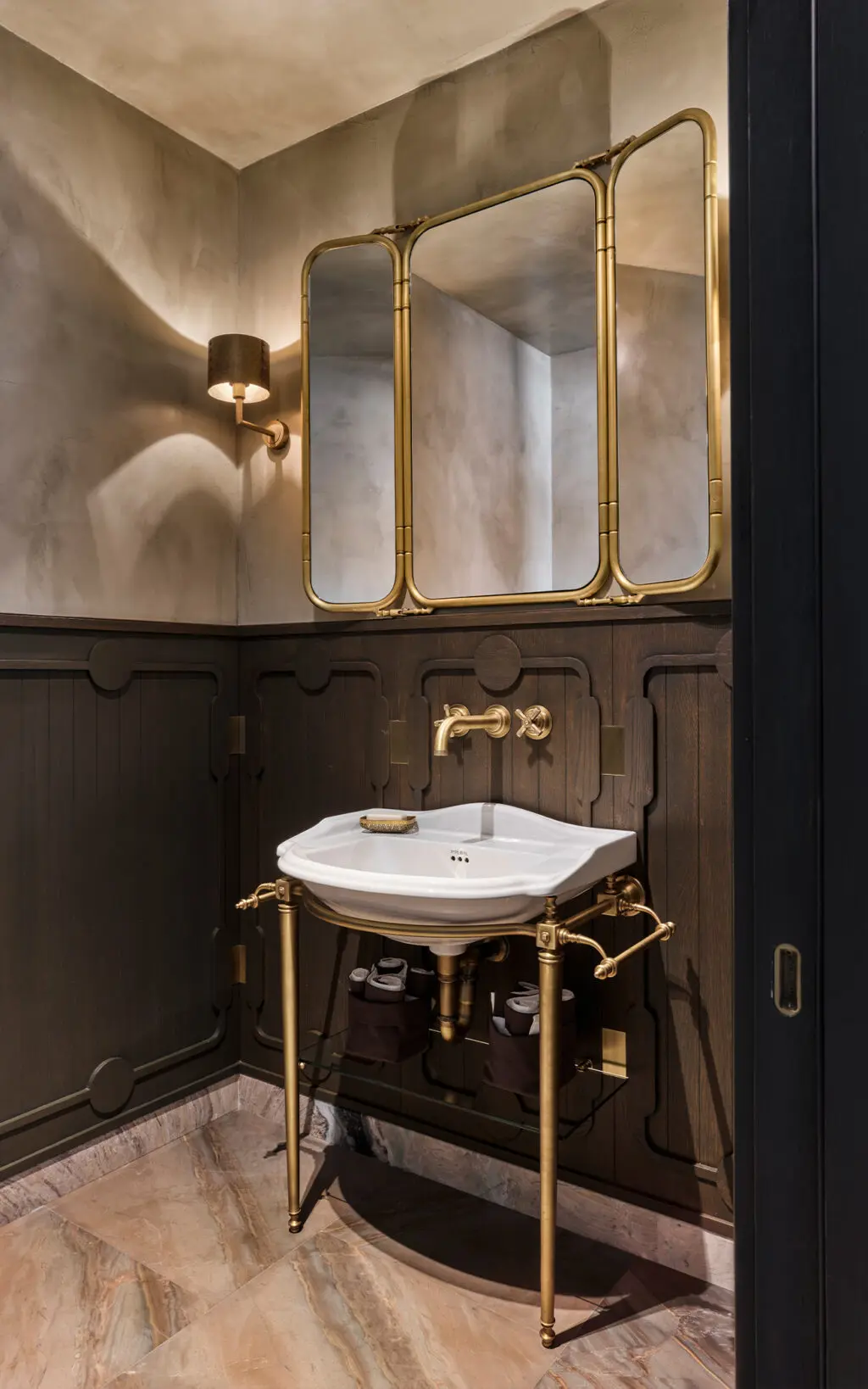 Landmark Industrial fixtures were selected for two bathrooms, while Style Moderne fixtures radiate Art Deco influence in the powder room. Designed with a bold and authoritative approach, these solid brass fixtures add strong design detail, while the Urban Brass & Non Lacquered finishes used across the bathrooms and additional powder room connect design integrity throughout the living space. Sanitaryware matching this cool metallic finish including a shower frame, basin legs and even cabinet hardware successfully ground the fantastical elements of the interiors with a demure, timeless narrative.