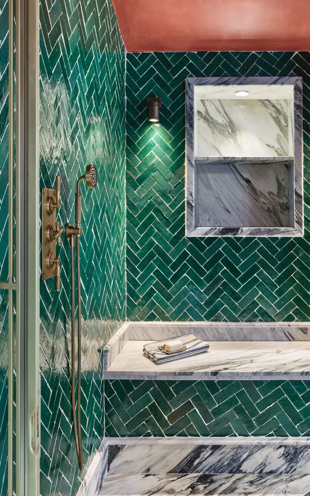 From architectural construction down to the final materials, Erdem Hamza aims to create living spaces that are as full of life as the cities that surround them. The studio looked to enhance attention to craftsmanship by using Italian polished plaster on multiple bathroom walls. This material effectively contrasts against the golden finish of the bath & shower mixer, basin tap and surrounding details and it’s coarse texture adds an extra layer of interest to complement the brushed detailing of Urban Brass.