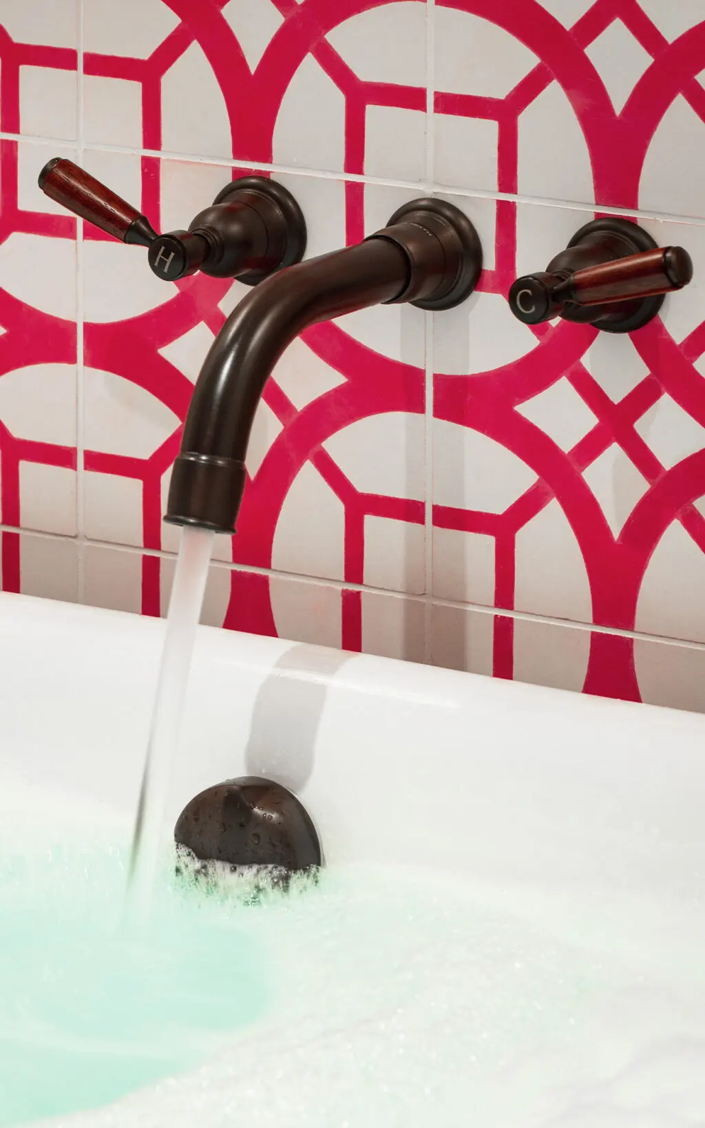 Each of the bedrooms are also designed with different themes to provide a fun experience for both new and returning guests. One ‘Pink & Green’ family room reveals a cubby-hole of bunkbeds concealed behind a curtain, while the other ‘red’ room features an alcove with a patterned tile mosaic. With each jazzy design feature comes a heavy dose of home comfort for that perfect feel of ‘home away from home’, including plush bedding and roll-top bathtubs paired with luxury brass shower mixers by Samuel Heath.