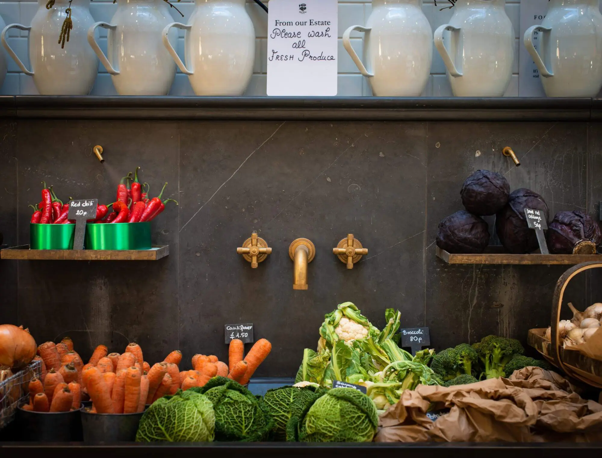 This is the first time we’ve seen Samuel Heath taps used in a farm shop, yet they look perfect amongst the local produce! The Landmark Industrial Collection with its knurling detail on the cross heads is a great choice for a rustic setting. With time and use, the unlacquered brushed brass will age and patina beautifully.