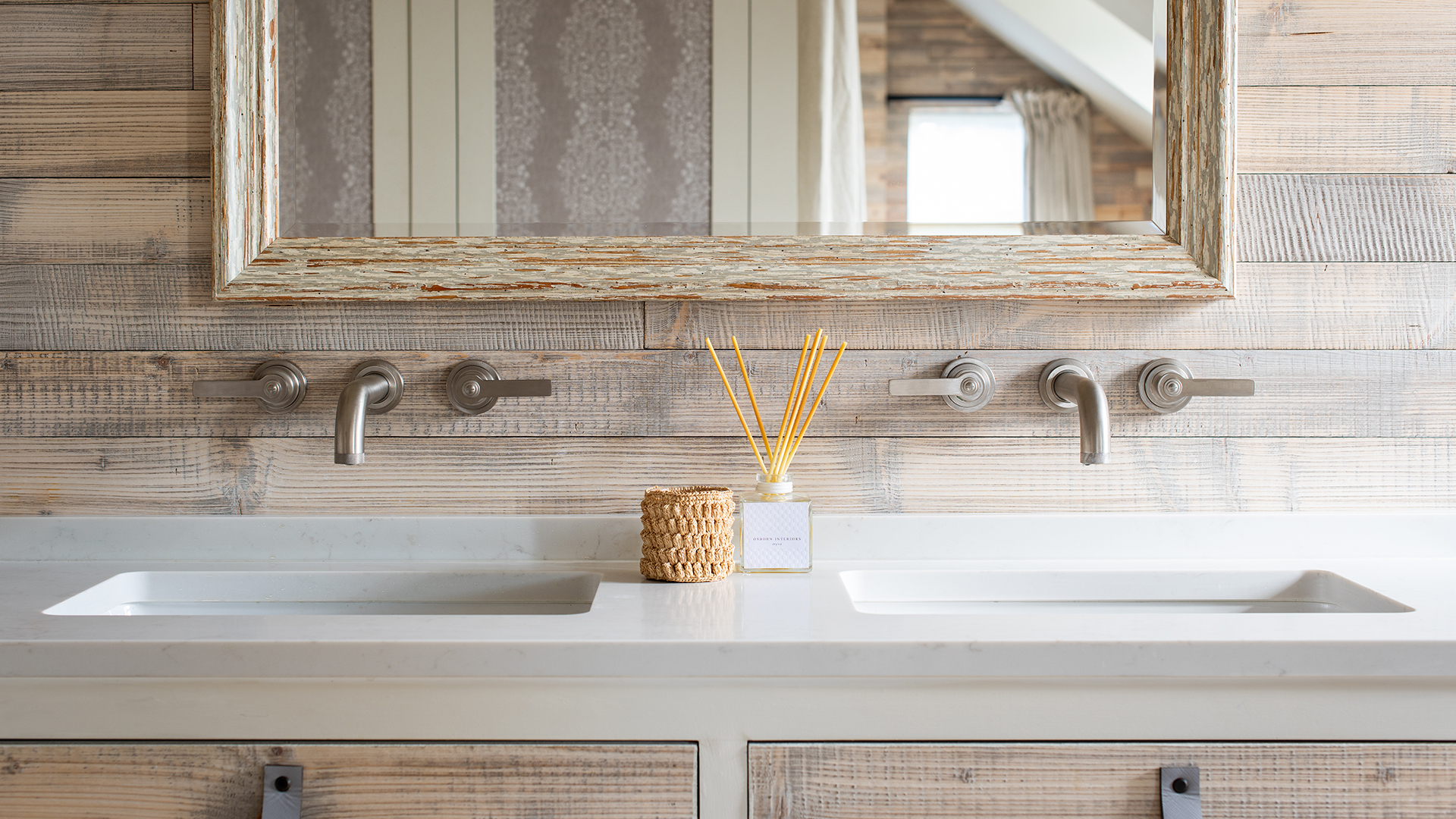 The master ensuite teases through the plank cladding theme with a bespoke washstand designed by Bee incorporating plank drawers and a quartz countertop. ‘I’ve always had a passion for a double vanity unit with two basins,’ explains Bee. LMK Pure Wall Mounted Basin Fillers in Stainless Steel heighten the drama. ‘This is my favourite Samuel Heath design,’ she notes. ‘I love the shape of the levers. They have a modern look to them, yet their design is clean. I particularly love the juxtaposition of the industrial stainless steel with the texture of the cladding and the way they sit together.’