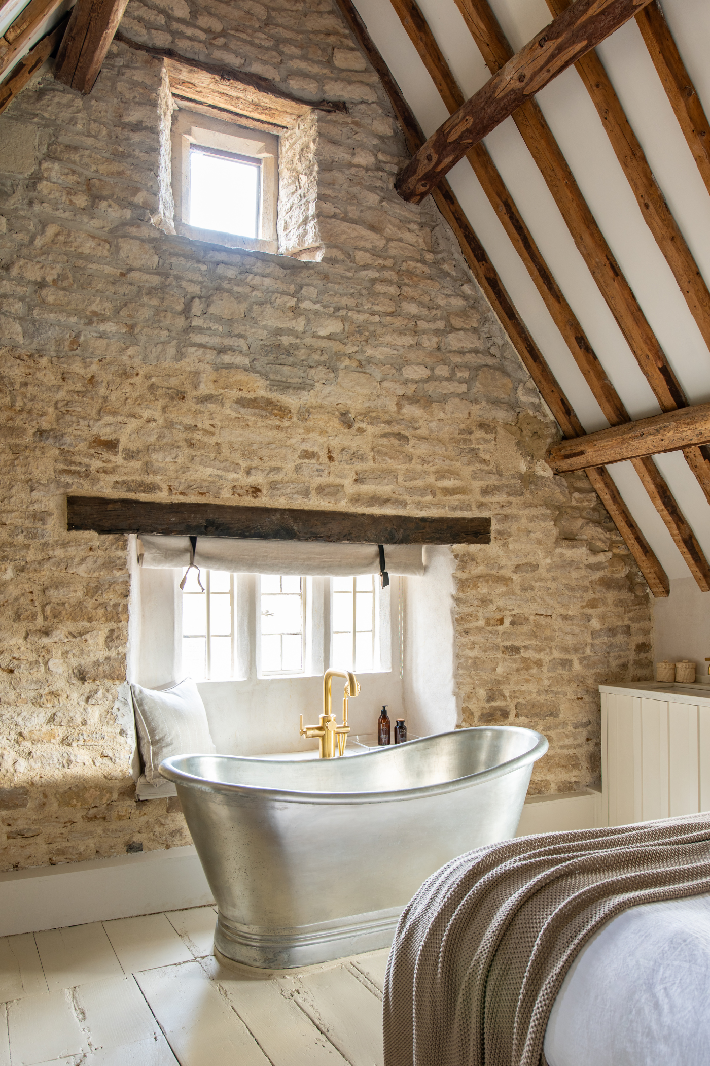In one of Bee’s daughters’ bedrooms, for instance, an impressive tin bateau bath injects an element of sophistication in front of the ancient leaded windows. ‘I designed this room with the bath being a real statement because I was taught once that you should see the most beautiful thing in the room the minute you enter,’ Bee explains. ‘I would like someone walking into this room to feel immensely special.’ In juxtaposition with the rugged exposed stone walls and rustic painted floorboards, the stately bath evokes a sense of escape. The opulent feel is enhanced by the LMK Pure floor mounted single lever bath/shower filler in an Urban Brass finish, with its elegant form working in both classic and contemporary schemes. The combination of the glacial hue of the metal rolltop and the rich golden warmth of the brassware elicits a frisson of visual intrigue. LMK Pure’s unlacquered brass finish develops over time into a rich and inviting patina, enhancing the brassware’s unique character and, in addition, complementing the period features of the room and echoing their evolution. ‘The Urban Brass living finish is one of my favourites because it gains a patina over time naturally,’ explains Bee. ‘It will darken, and I think these two natural materials together are incredibly attractive. I chose them so that the two would blend and there is the organic feel of them ageing.’ Softening the scheme and enhancing the inviting feel are an oversized linen headboard, relaxed linen bedding and textural cotton throws, all in a soothing neutral palette.
