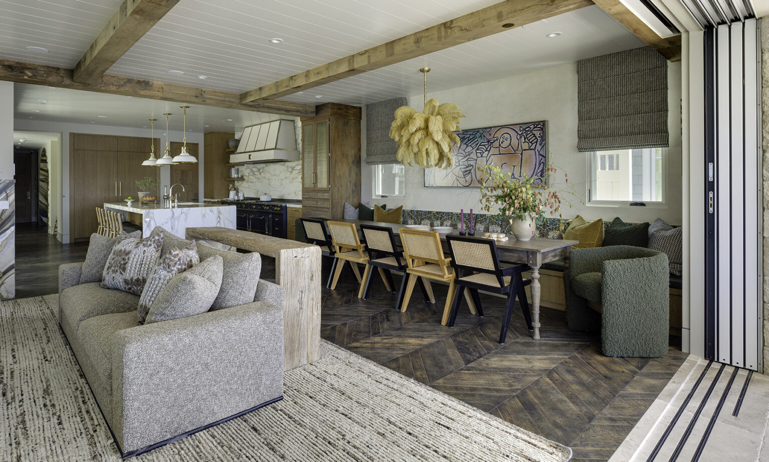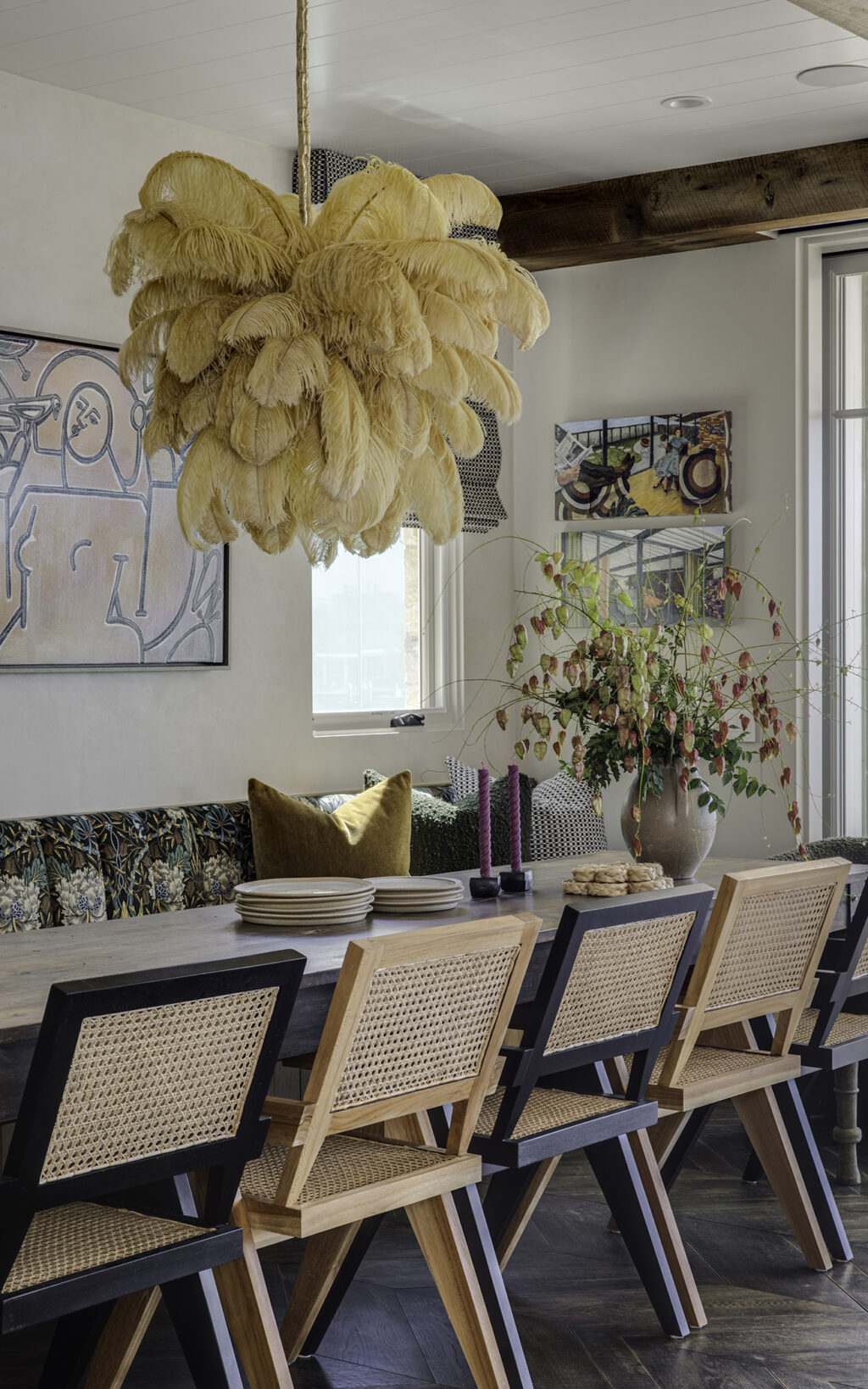 From the emerald green jaguar carpeting and floor-to-ceiling floral wallpaper in the bunk room, to the monumental 59-bulb Lindsey Adelman chandelier in the entryway, every room offers its own rhythm that is layered and luxe, bold and balanced – and always a true reflection of the client’s unique taste.