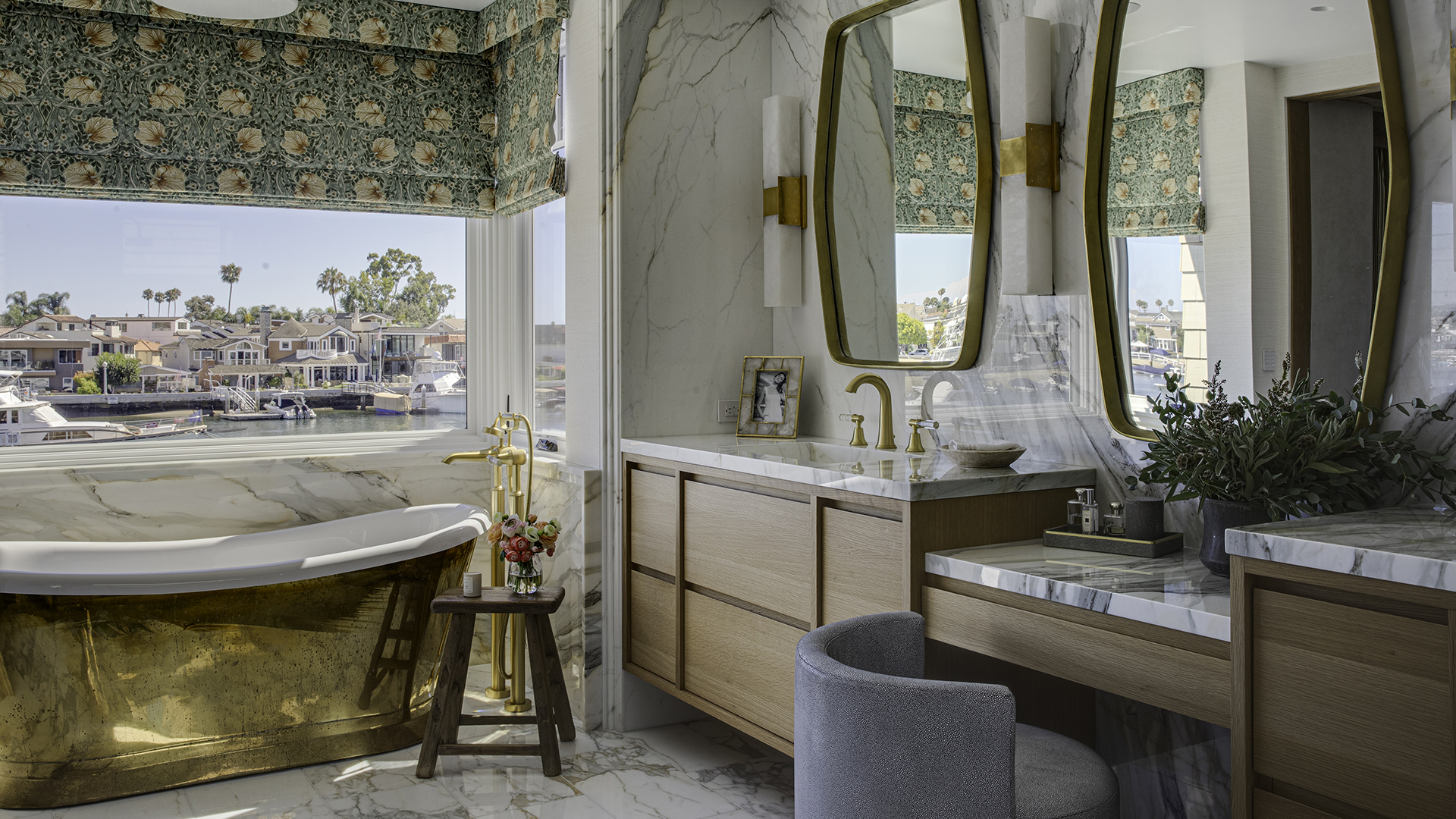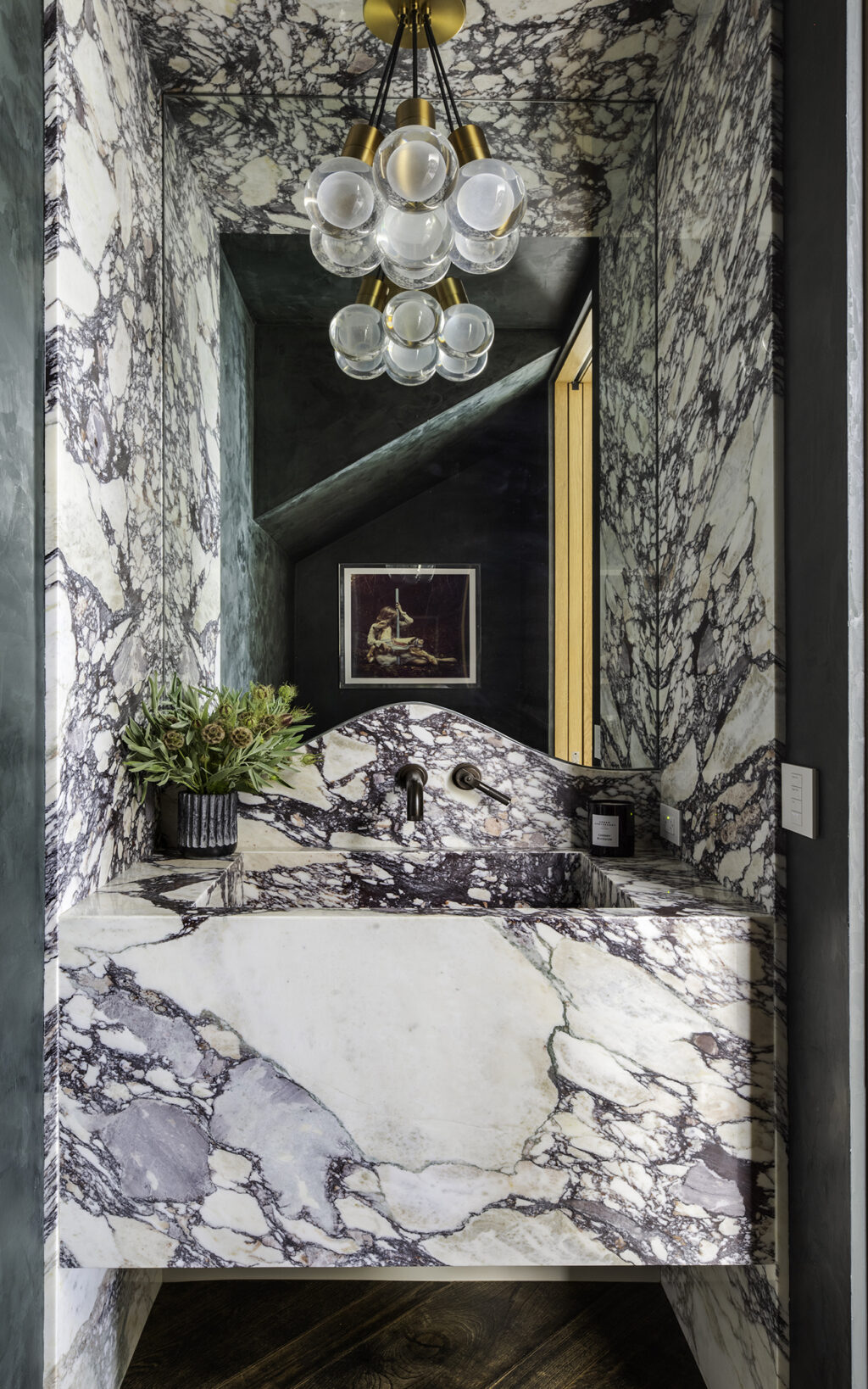 The room is clad floor-to-ceiling in Calacatta Borghini stone, setting a serene, monolithic tone. Visual Comfort lighting, Morris & Co blinds, and bespoke detailing balance the room’s vibrant composition, creating a haven of indulgence and design precision.