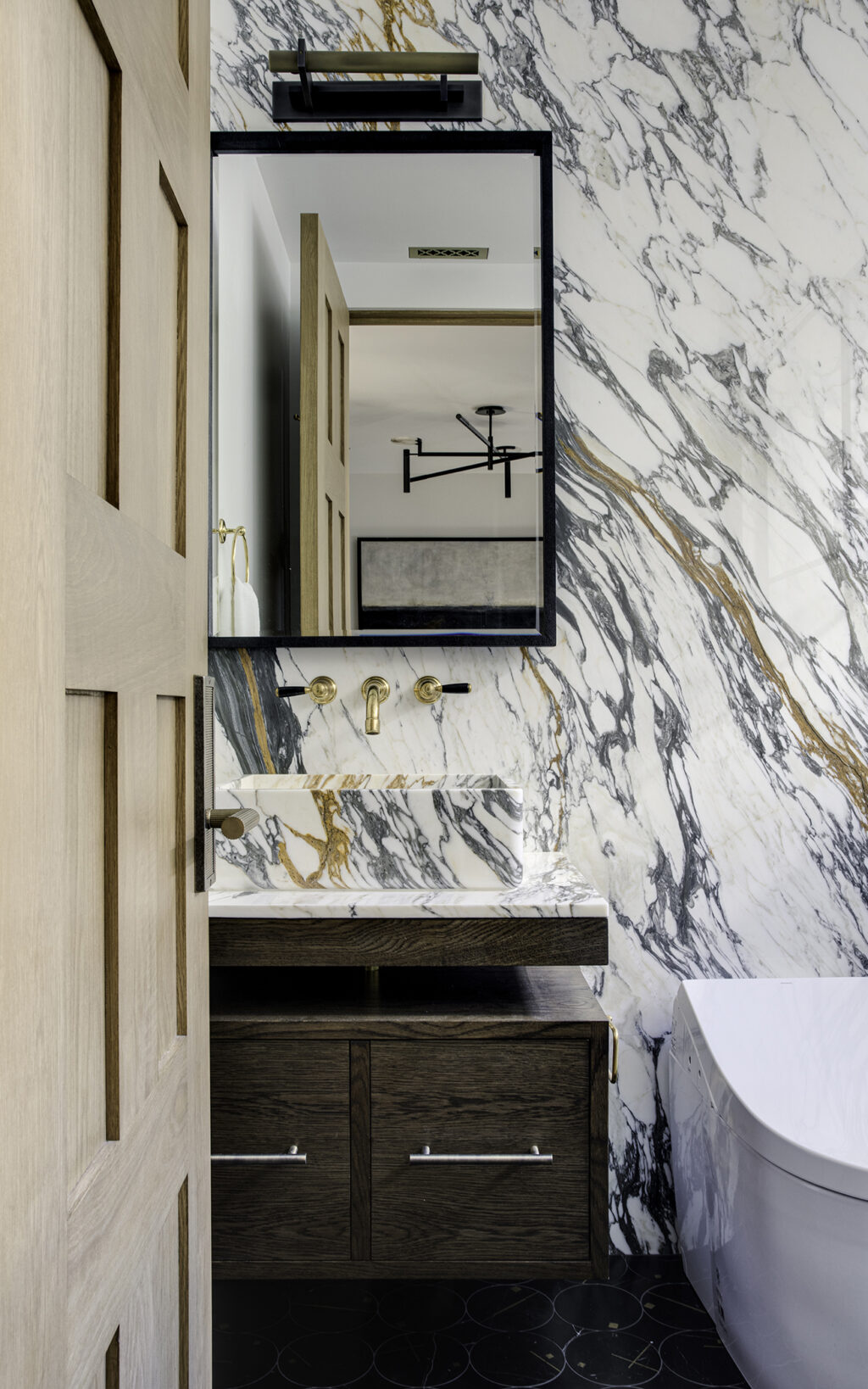 For the main Powder Room, Bryen opted for Samuel Heath’s LMK Industrial Basin Mixer in City Bronze, selected for its ability to anchor the space visually against the high-drama backdrop of Calacatta Monet marble. The specification features a unique angled lever, selected without a backplate for a pared-back, architectural finish. “We needed a fixture that would be able to hold its own against the slab and light fixture,” explains Bryen. “The LMK Industrial faucet worked amazingly. We love the attention to detail and the sophisticated elements.” Walls are finished in Venetian plaster by Applied Plastering, while the lighting, sourced from Circa Lighting, casts a soft, ambient glow across the deep veining of the stone.