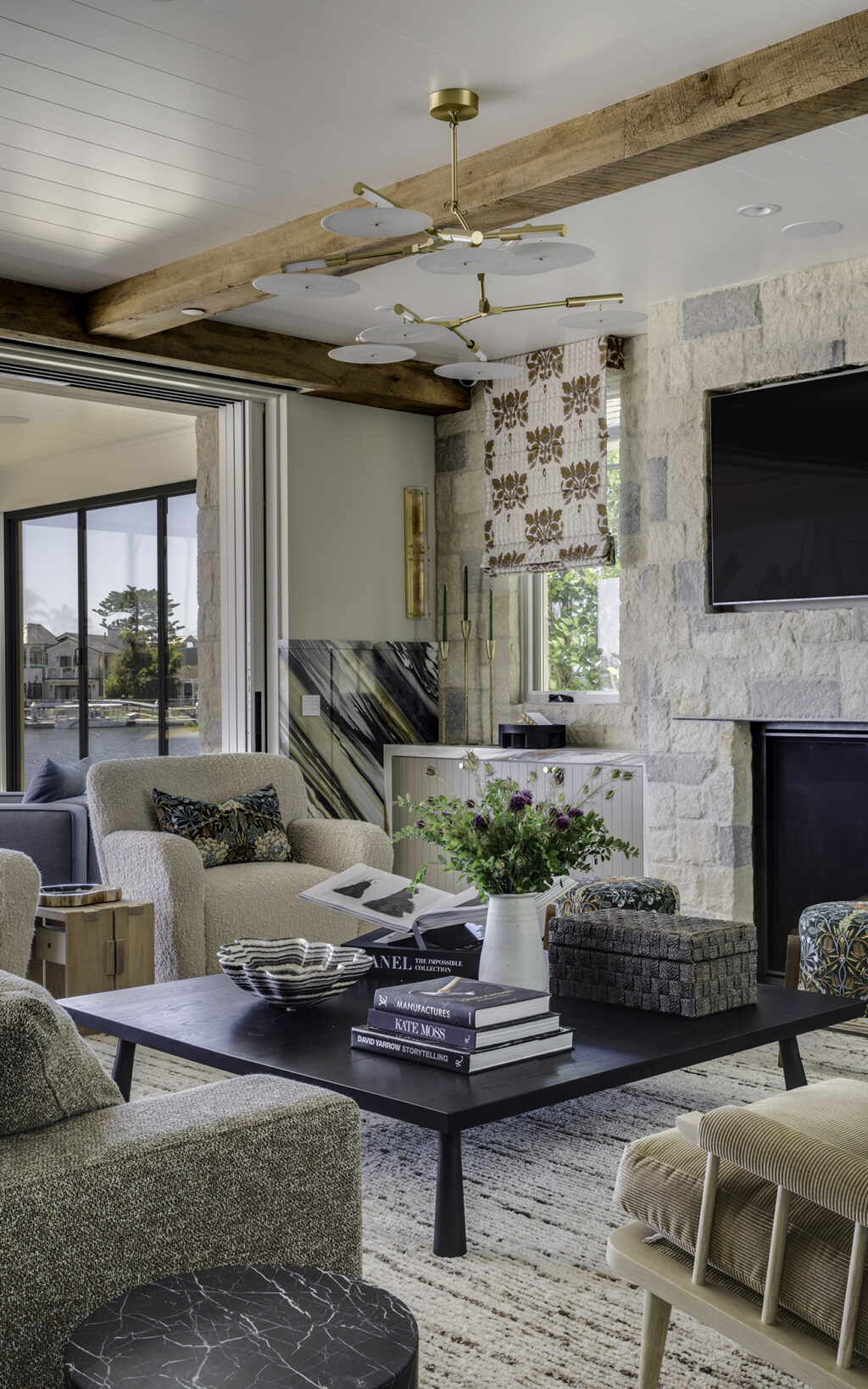 The tonal direction throughout the home is what Bryen refers to as “sophisticated opulence with a pop.” Across every room, deep colour stories and architectural forms are enriched by bold textures, gold metallic highlights, and fine detailing. In the lounge turned green room, for example, an intricate coffered ceiling and chevron wood flooring frame a dramatic stone fireplace. A second larger living area includes a Lindsey Adelman Studio Branching Disk chandelier, adding contemporary poise above a Rene Cazares sofa and Black Creek Mercantile coffee table.