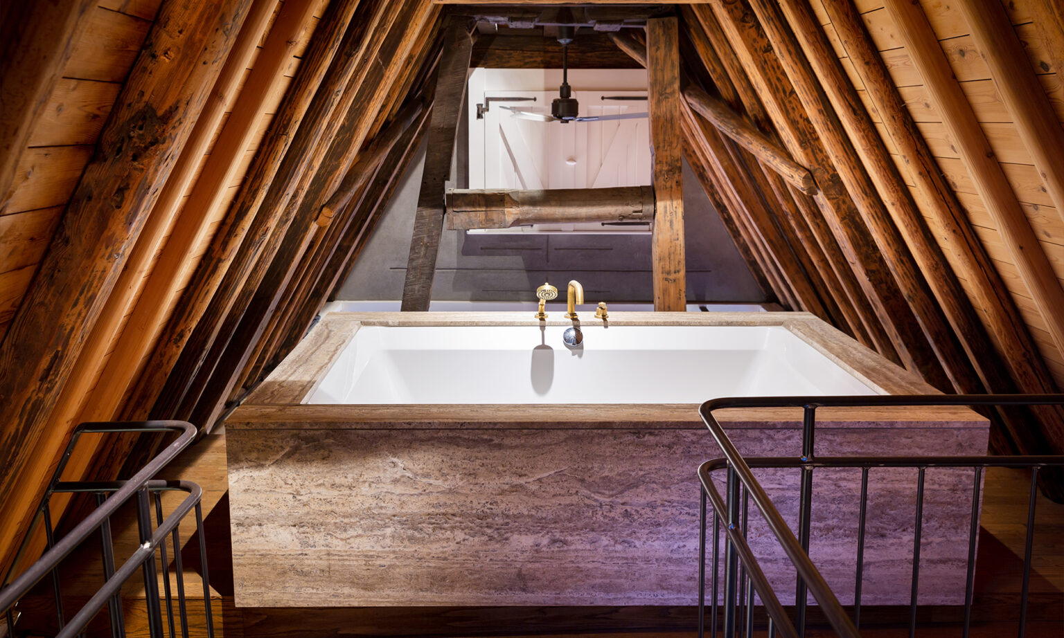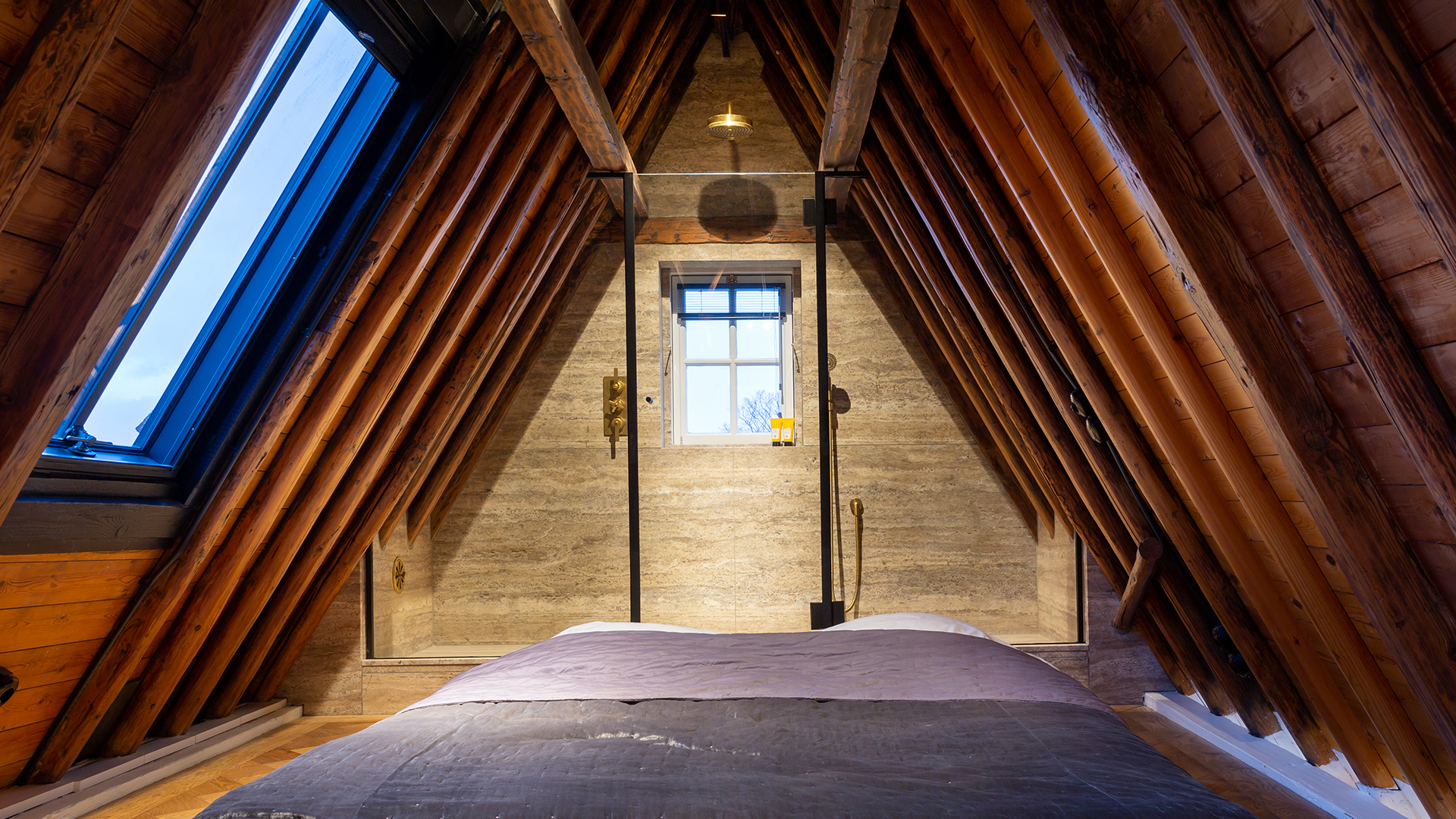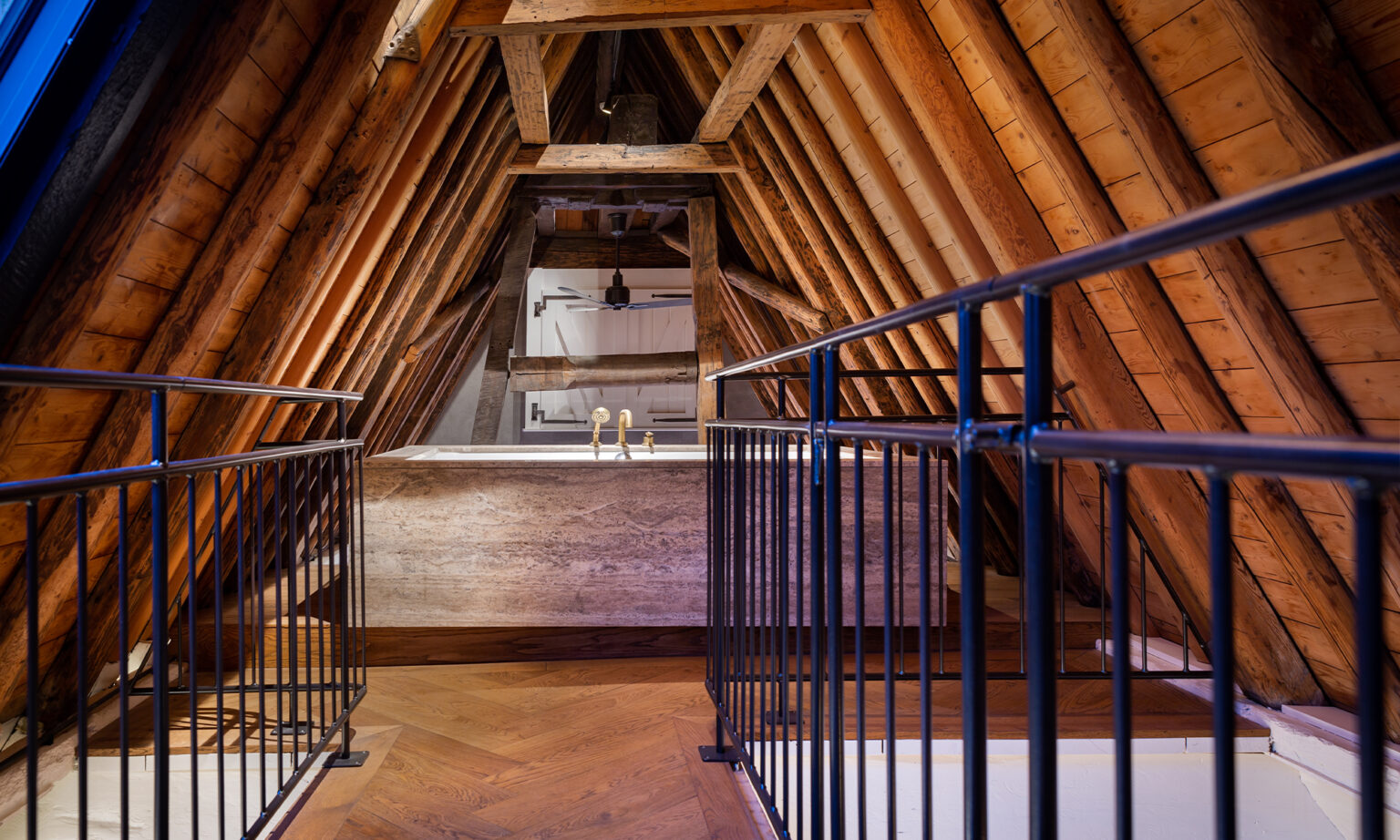 The transcendence of ‘classic industrial’ interiors is perhaps most prominent in the unconventional bedroom-turned-bathroom – a fine example of innovative Dutch design. Here, an arch-shaped room housing only a bed makes way to a walk-in shower, perfectly nestled beneath the beams of the ceiling. The addition of simplistic LMK Pure concealed thermostatic shower fixtures create a bold statement against light travertine marble, while a golden Urban Brass finish gently elevates an earthy colour scheme. The bathroom encapsulates the premise of the brief by offering the luxuries of modern living while complementing the classic architecture of Keizergracht.
