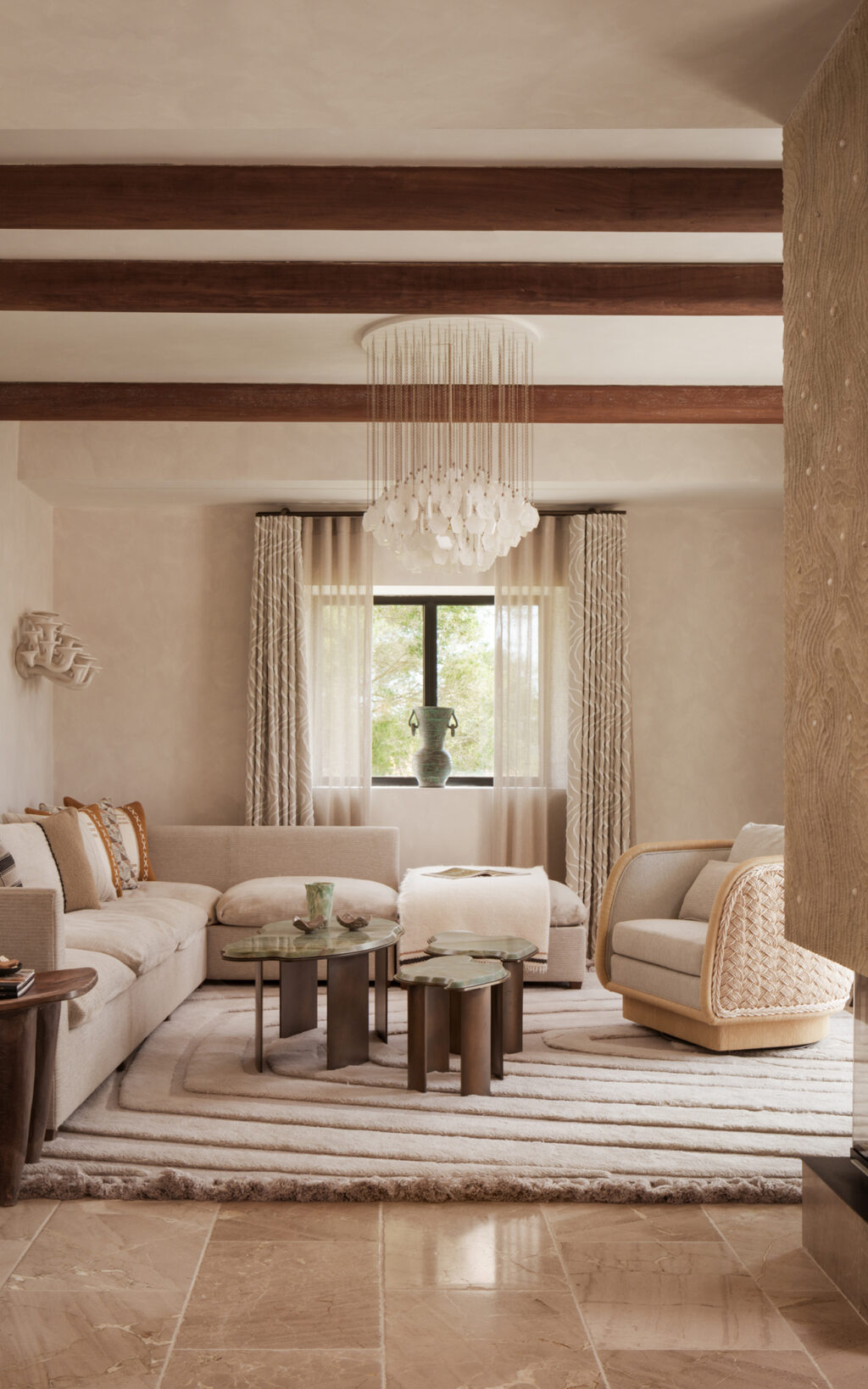 The four-bedroom, five-bathroom finca opens with serene intention, its living spaces flowing seamlessly from one to the next, grounded in natural materials and a mellow palette drawn from the Mallorcan landscape. “We drew inspiration from the rich tapestry of local stories,” explains Soliman, referencing the ancient terrain of the Serra de Tramuntana, the rugged textures of its mountains, the vibrant marine life, and the island’s historic pearl industry.