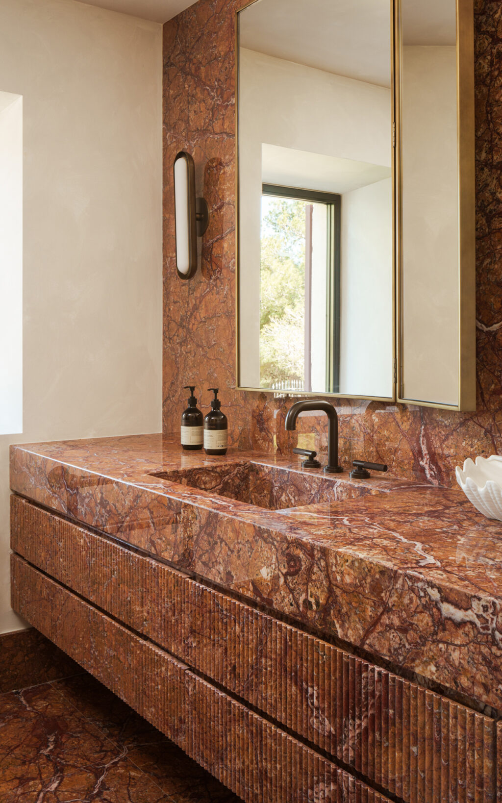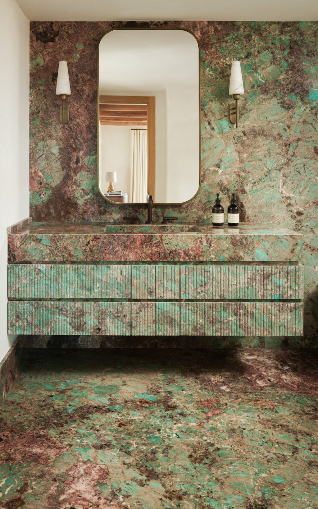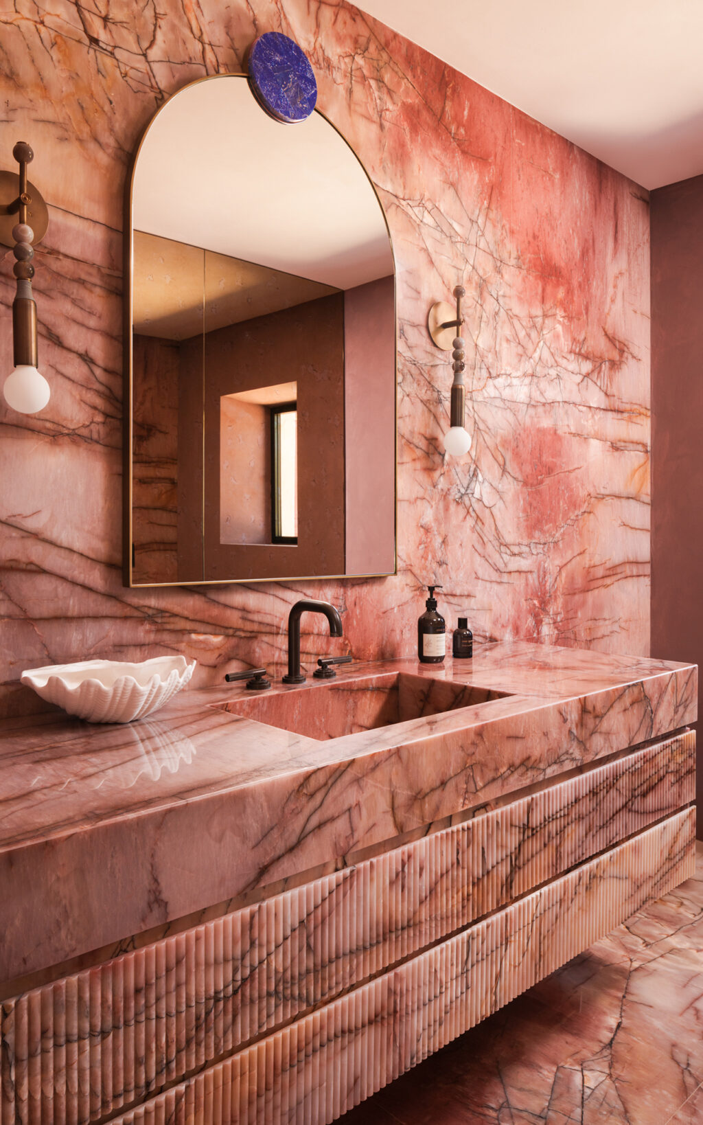 Each of the five bathrooms is clad in a single stone, enveloping the room in extraordinary colour and pattern. In one guest suite, vibrant pink slabs wrap the space and in another, a vein-cut travertine with warm terracotta undertones glows under natural light. Two more bathrooms explore contrasting shades of green – one soft and sage-like with gentle white veining, the other leaning towards turquoise, dappled with brown tones reminiscent of variscite. Vanity furniture, designed by Bergman Design House and crafted by Luxurious Italian Furnishings Ltd, is paired with statement lighting from Apparatus Studio and Northern Lights, and finished with bespoke mirrors above.