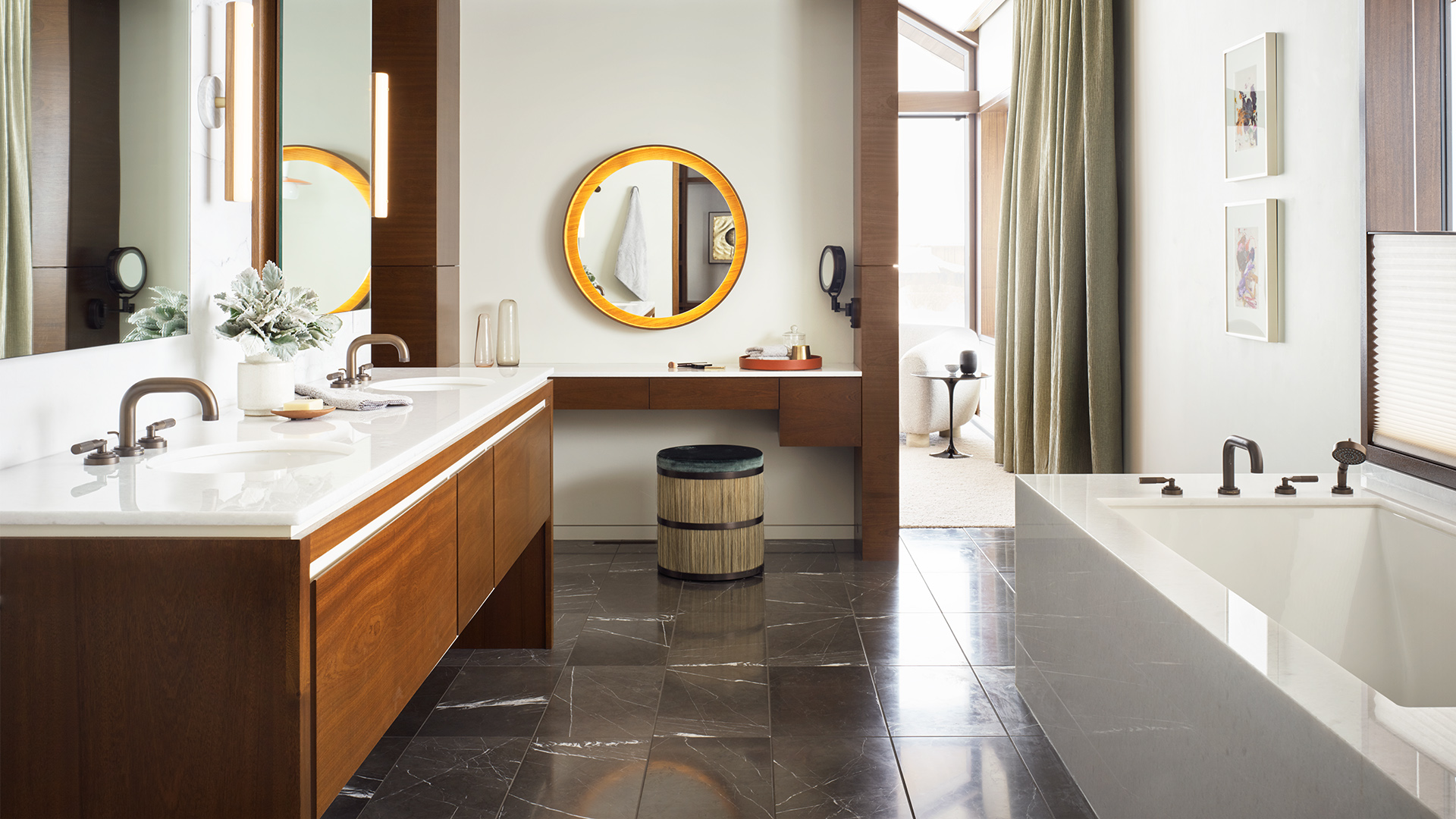 The awe-inspiring detail of Lone Pine pays homage to artisanal influence, with a running theme of ironmongery that enhances the merger of form and function. This includes a steel and leather entry door and a steel stair railing with leather strapping. Meanwhile, the upper master bathroom is fitted with traditional brass accessories by Samuel heath. The client selected our LMK Industrial collection of brass basin faucets, bath and shower fixtures and a wall-mounted mirror. This collection has a Bauhaus influence, which offers a new artistic flair to the space. A City Bronze finish also complements the warm & decadent palette of surrounding wooden cabinetry and marble flooring.