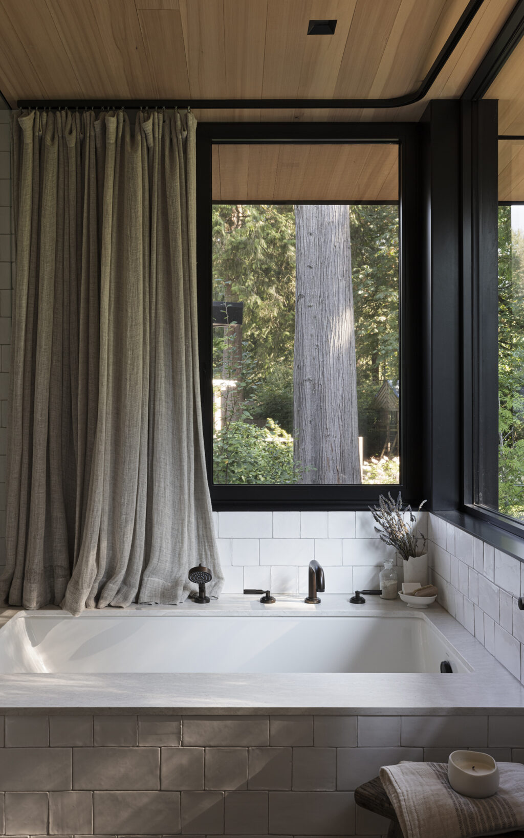Erica capitalised on Olson Kundig’s vision – a modern industrial structure comprising weathered timber cladding, textural concrete and swathes of black metal framed floor-to-ceiling glazing. With the backdrop of an interior featuring complementary dramatic blackened steel beams that anchor the scheme, Erica took her inspiration from modern country interiors. The sublime result is a celebration of natural materials. Stained hemlock-lined ceilings and white oak wide-planked flooring induce an intimate, cabin-like aesthetic and elicit cohesivity with the surroundings. The walls were then painted a soothing warm white, which acts as a calming blank canvas.