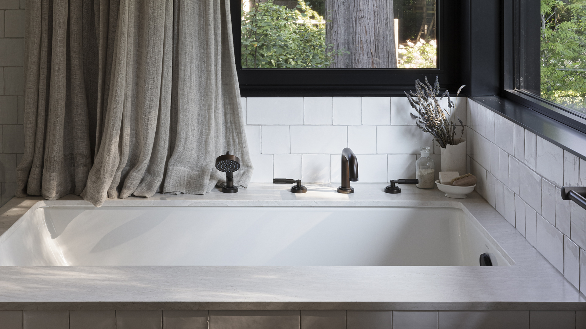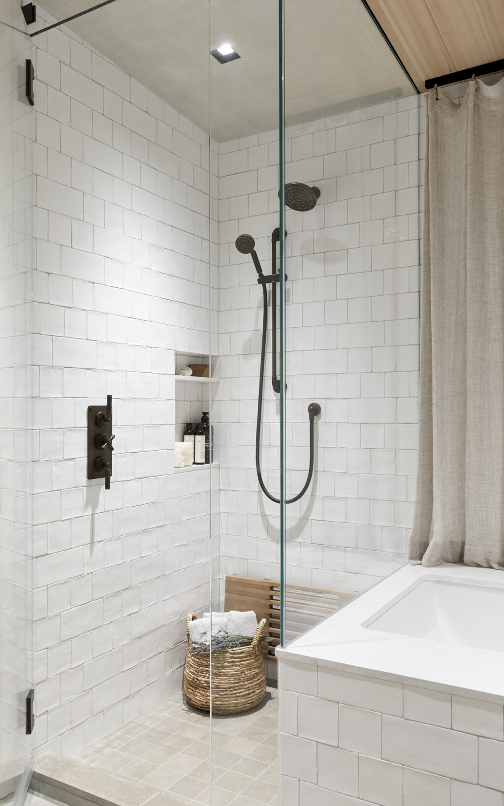 Dark metal accents were brought in for drama and to evoke a cohesive look that blends with the window frames. Samuel Heath LMK brassware in a deeply hued City Bronze finish elevates the scheme beautifully and counterbalances the pale aesthetic. ‘The Samuel Heath fixtures were absolutely key to achieving this balance and were so important to the overall palette of the room – they truly grounded us to the aesthetic we were trying to achieve throughout the whole home and then allowed us to move in a slightly different direction without veering off course,’ says Erica. She credits LMK with allowing her to bring in the delicate tiles and creamy stone countertop while remaining tied to the more traditionally masculine and industrial elements of the overall palette. ‘We particularly loved that the brassware is matt in finish, yet rich in tone. The deep warm brown paired beautifully with the walnut vanity, and we selected a honed quartz counter that has this same earthy warmth mixed through the creamy marbling. The City Bronze finish is too unique not to fall in love with.’