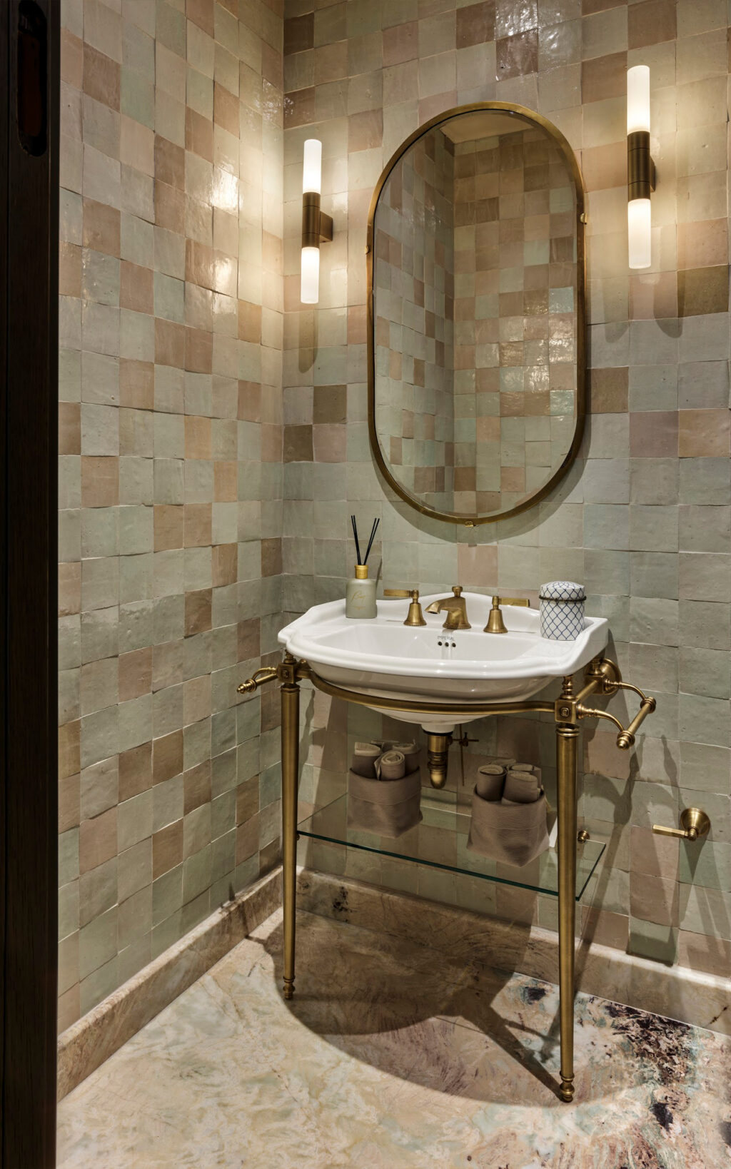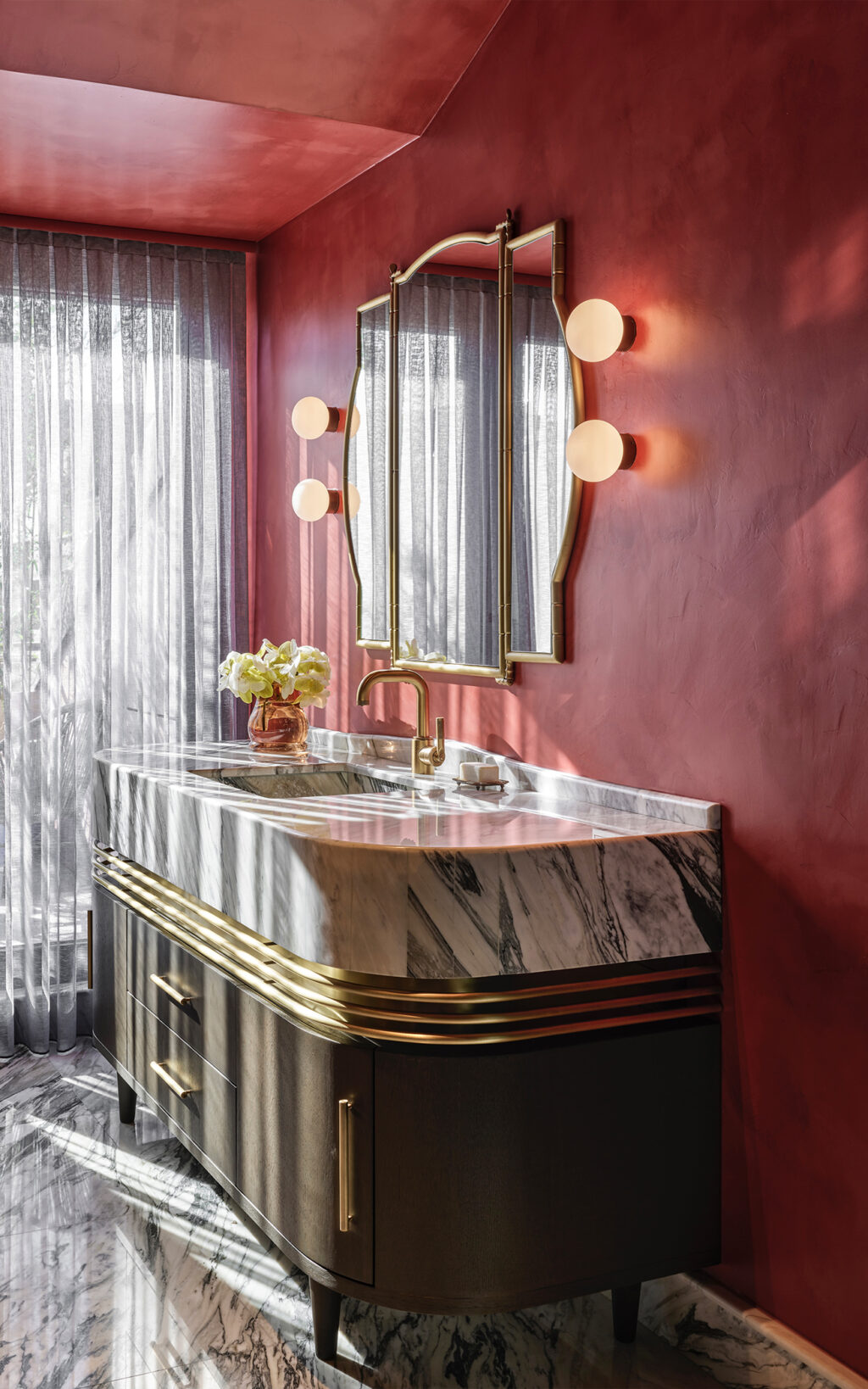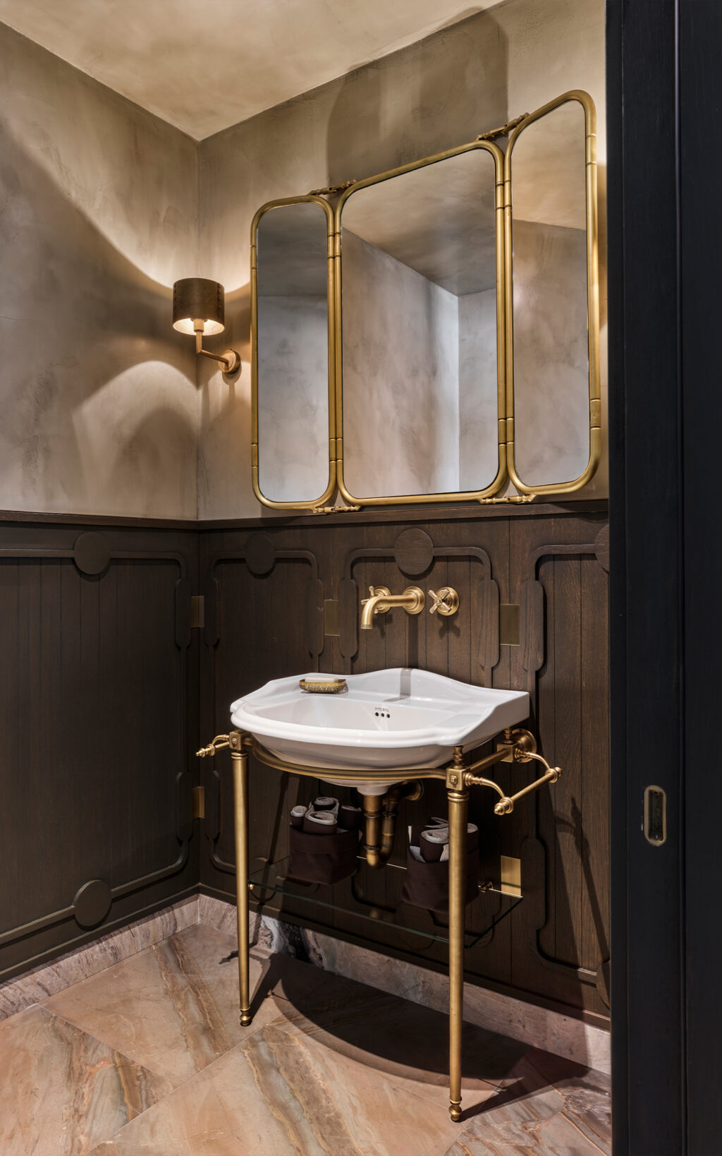 LMK Industrial fixtures were selected for two bathrooms, while Style Moderne fixtures radiate Art Deco influence in the powder room. Designed with a bold and authoritative approach, these solid brass fixtures add strong design detail, while the Urban Brass & Non Lacquered finishes used across the bathrooms and additional powder room connect design integrity throughout the living space. Sanitaryware matching this cool metallic finish including a shower frame, basin legs and even cabinet hardware successfully ground the fantastical elements of the interiors with a demure, timeless narrative.